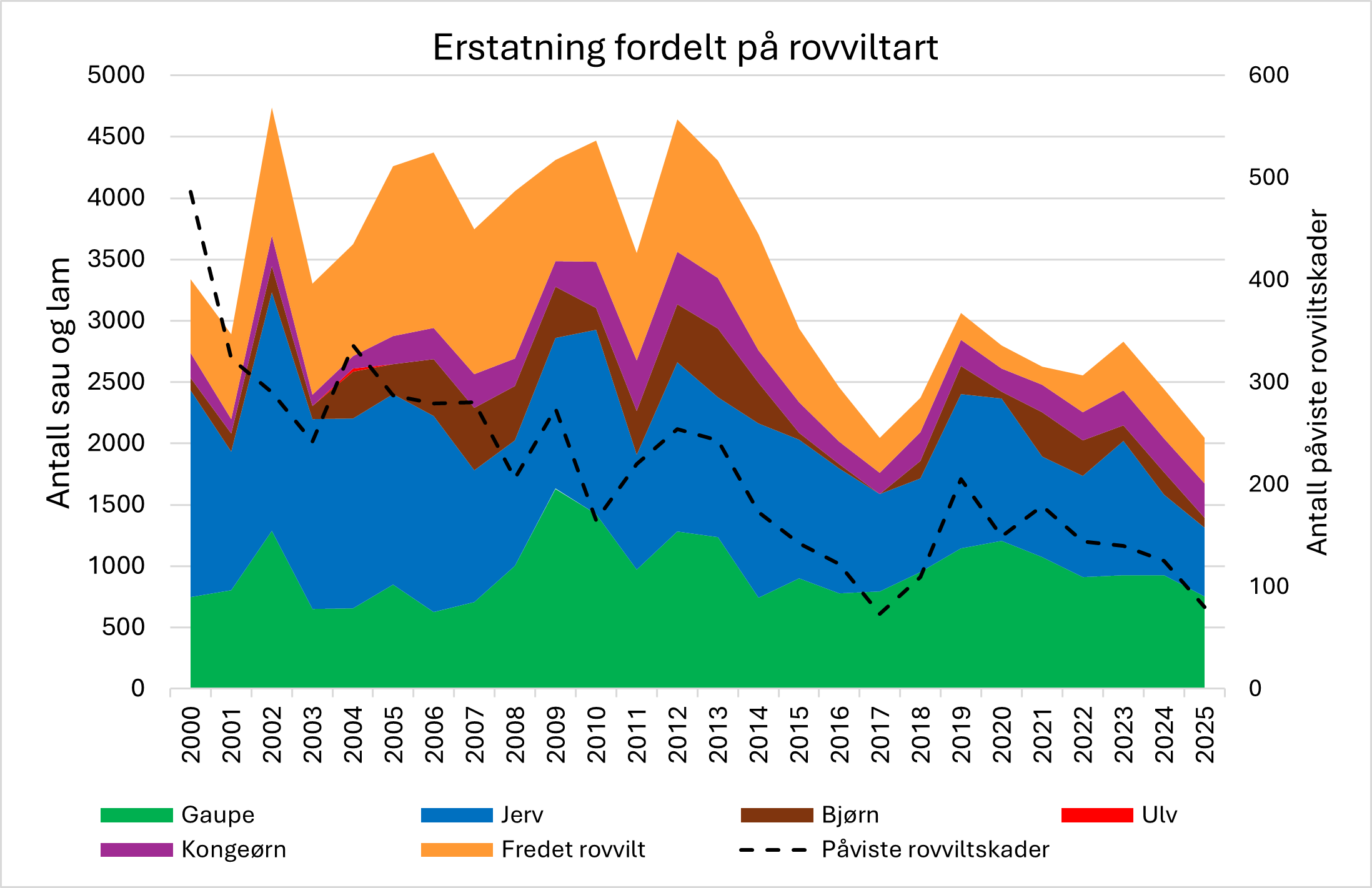 Figuren viser erstatning fordelt på rovviltartene gaupe, jerv, kongeørn, bjørn, ulv og ukjent fredet rovvilt, samt påviste rovviltskader i perioden 2000 - 2025.