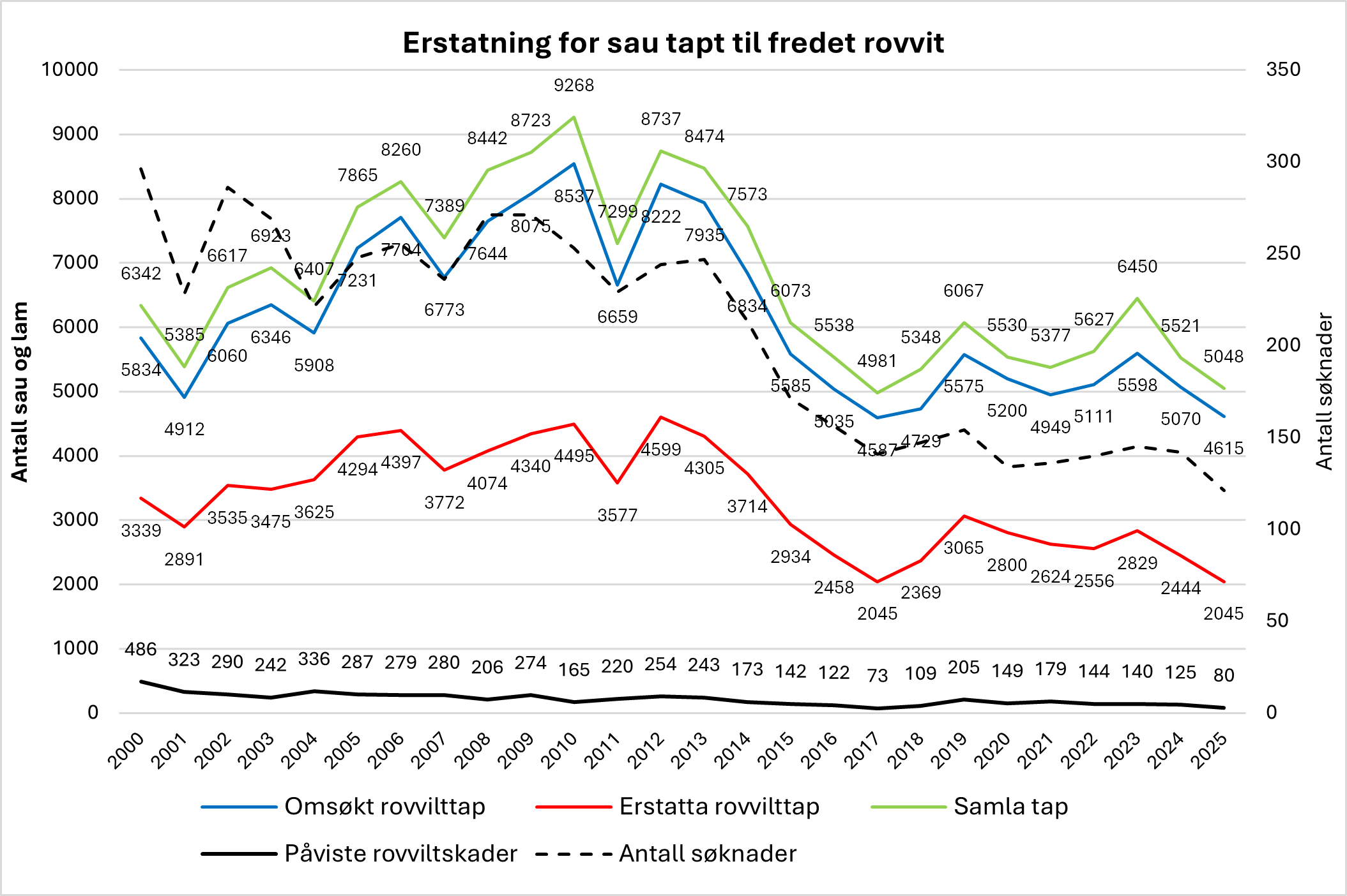Figuren viser oversikt over erstatningsoppgjøret for sau tapt til fredet rovvilt. Fordelt på samla tap, omsøkt tap, erstatta tap, påvist tapt og antall søkere i perioden 2000 - 2025.