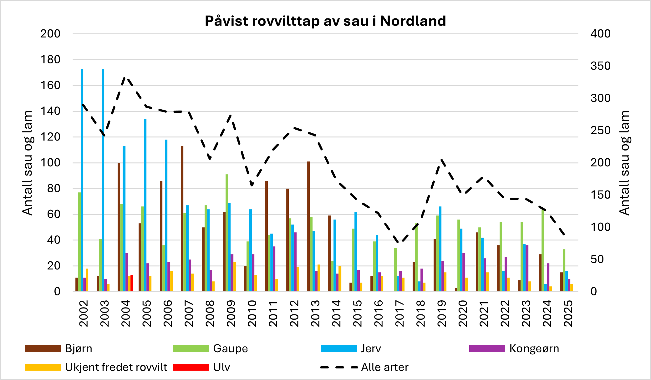 Figuren viser påvist rovvilttap fordelt på rovviltartene gaupe, jerv, bjørn, ulv, kongeørn og ukjent fredet rovvilt, samt alle arter i perioden 2002 - 2025 på sekundæraksen.
