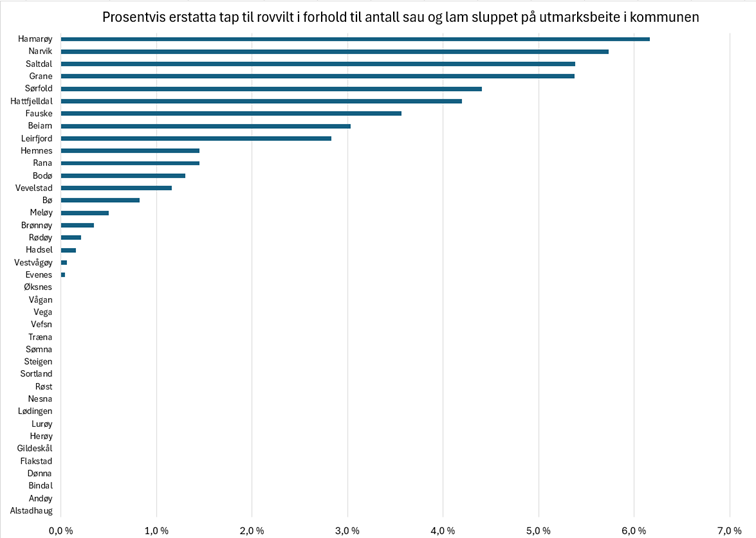 Figuren viser prosentvis erstatta tap til rovvilt i forhold til antall sau og lam sluppet på utmarksbeite i kommunen i 2025. Alle kommunene i Nordland er representert.