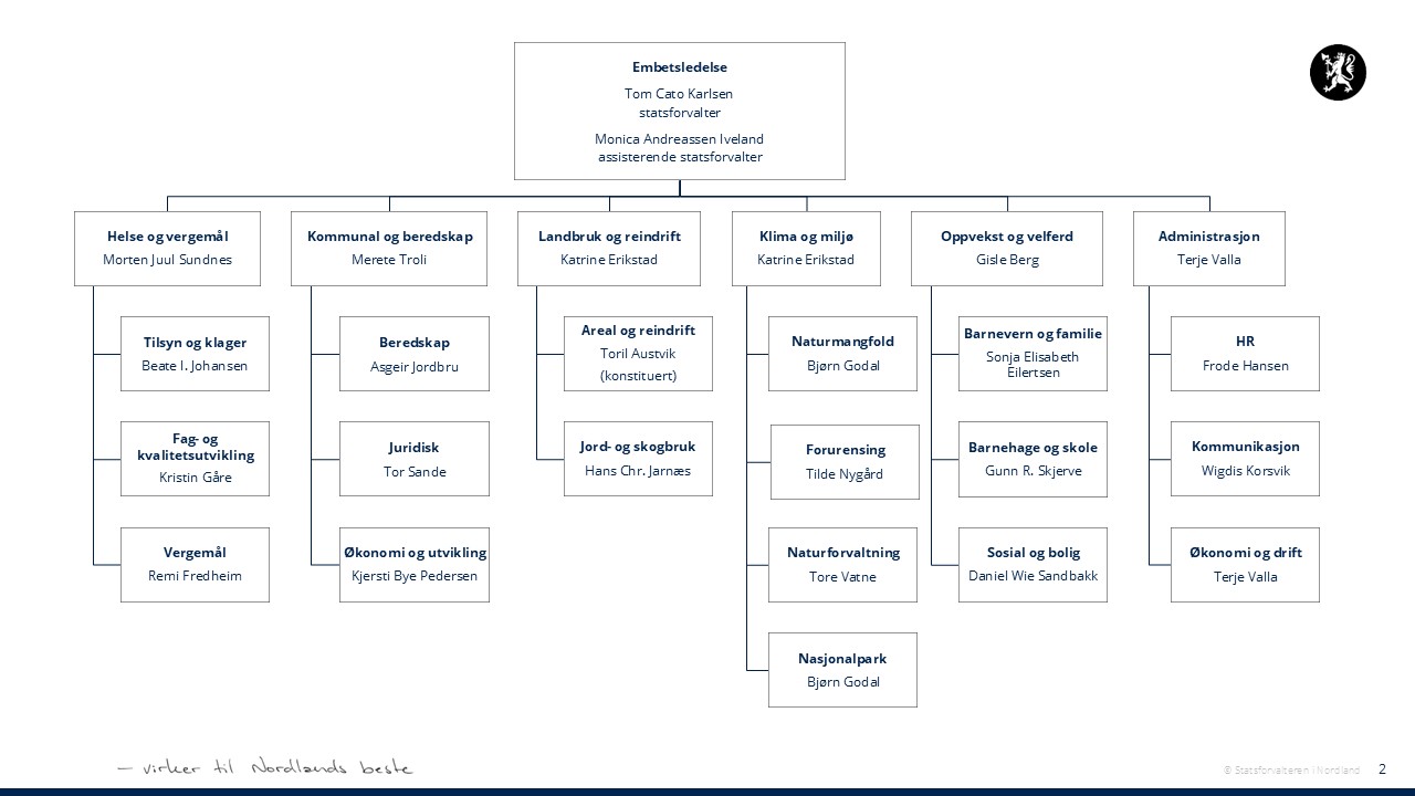 Statsforvalteren er ulikt organisert fra fylke til fylke. Statsforvalteren i Nordland har omlag 180 ansatte fordelt på embetsledelsen og seks avdelinger.