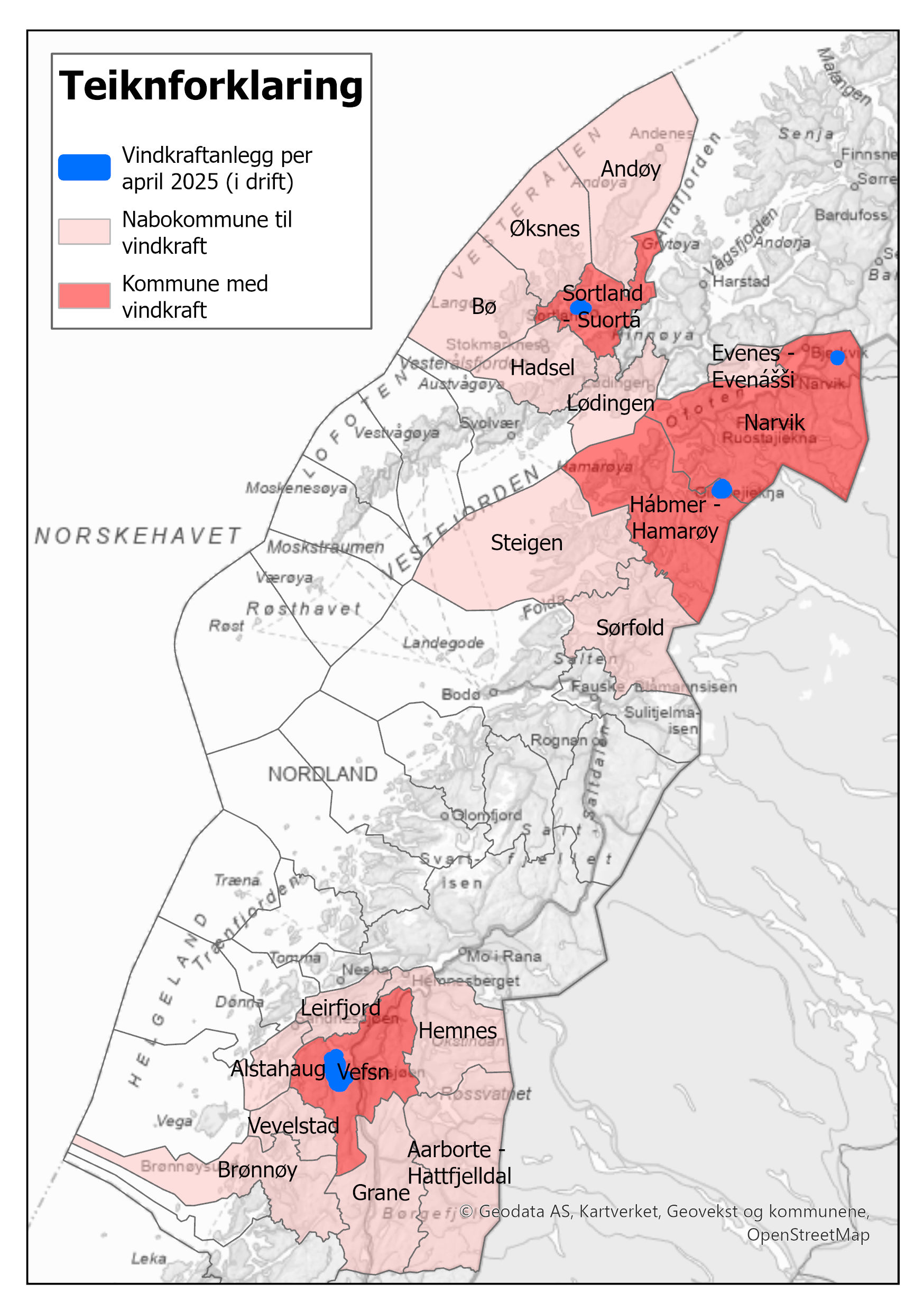 Kartet under viser ei oversikt over kva kommunar som er berørt av landbaserte vindkraftverk.
