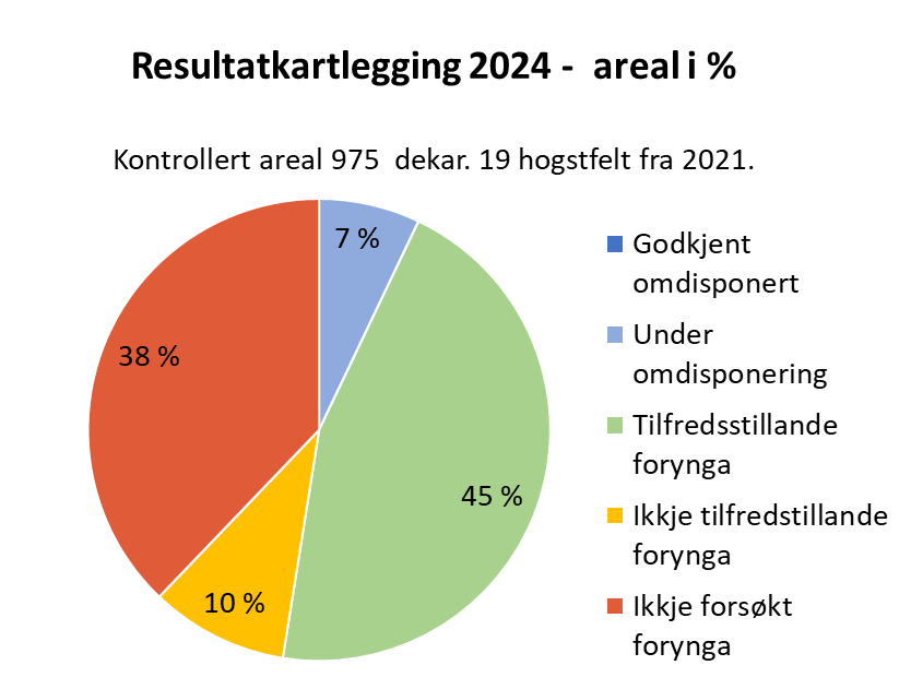 Resultata frå 2024 blei også lagt fram – fig. 1. Tala for 2024 viser mellom anna at 38 % av hogstfelta står utan aktive tiltak på 3- årskontrollen. 45 % av kontrollarealet har tilfredsstillande forynging.