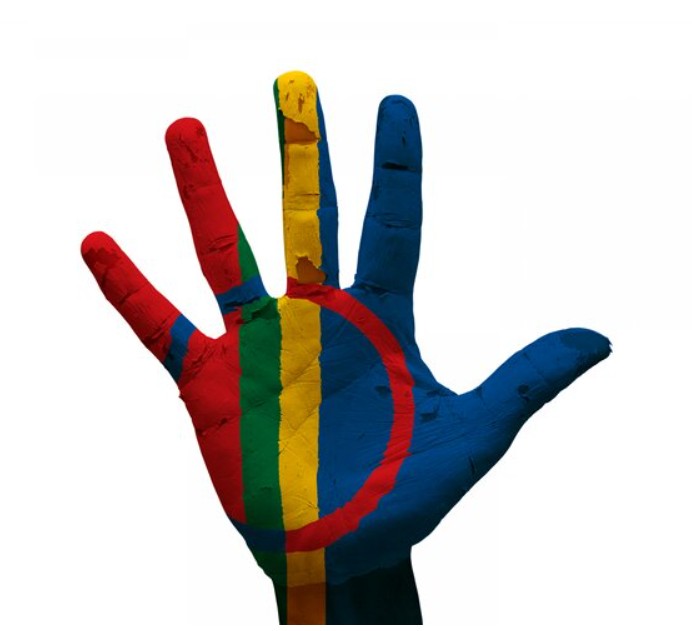 Det samiske flagget er malt i en hånd Foto mostphotos.com