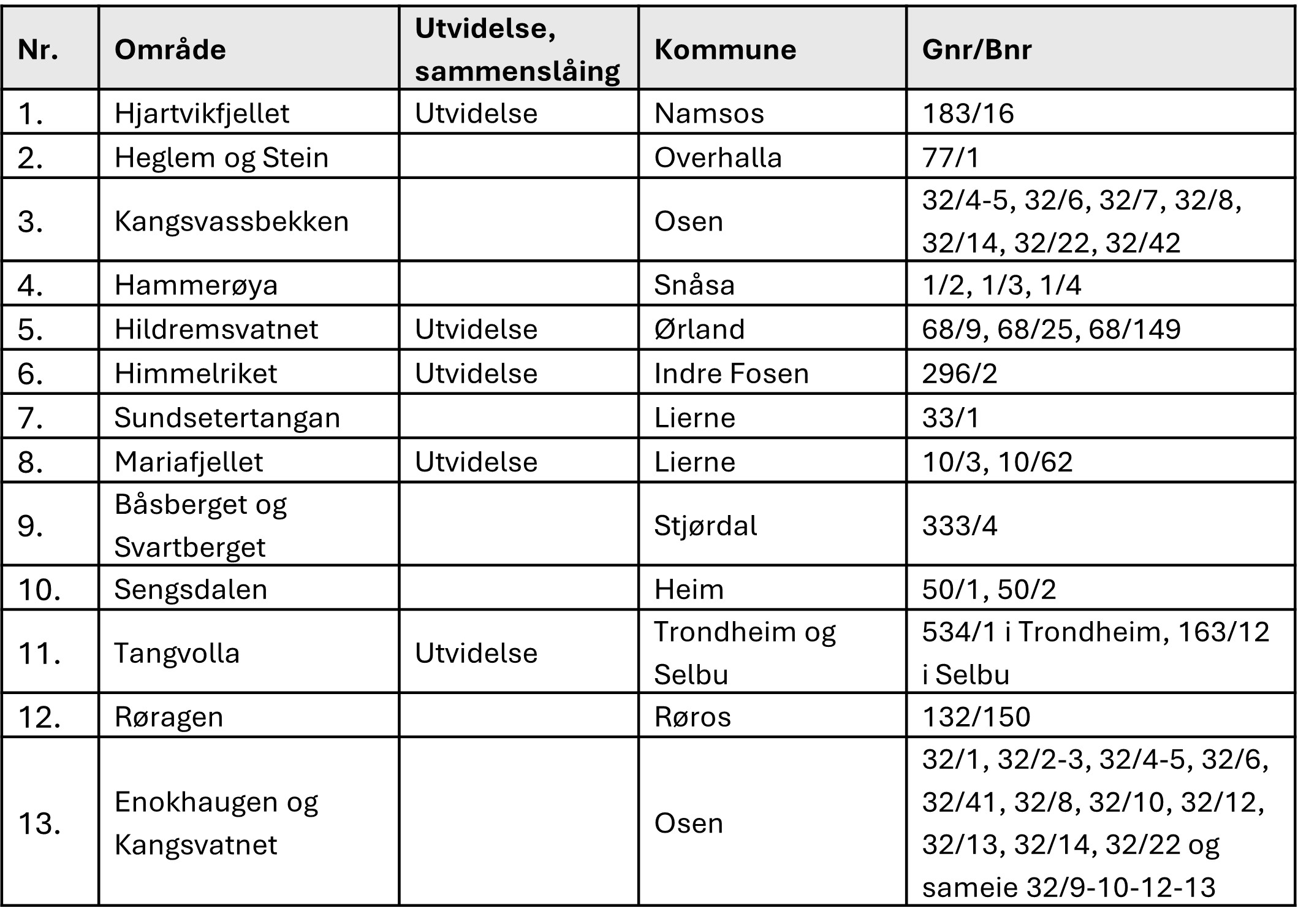 Oppstartsmeldingen markerer oppstart av verneprosess for åtte nye naturreservater og fem utvidelser av eksisterende naturreservater. Områdene har skogtyper som blant annet bekkekløft, ravine, boreal regnskog, kalkskog, gammel skog, flommarkskog og edelløvskog. En kort beskrivelse og kart for hvert enkelt område ligger i kolonnen til høyre. (Eventuelt nederst på mobil visning)