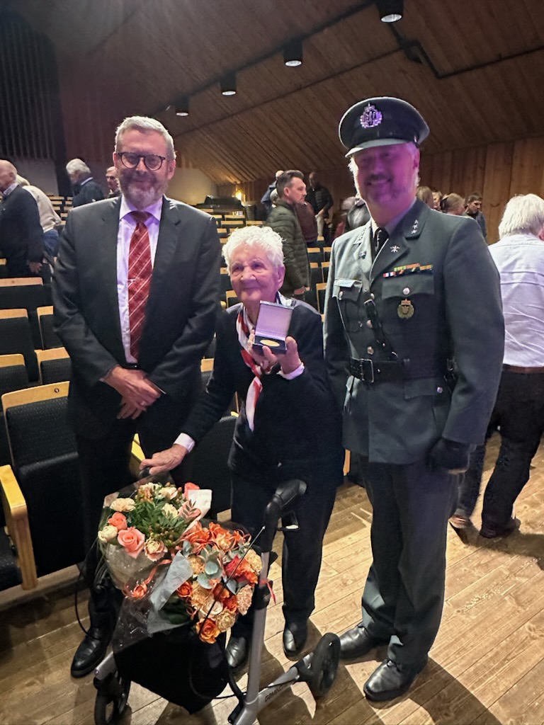 Onsdag kveld ble Regjeringens minnemedalje delt ut til Ingebjørg Hansen (99) – for heltemodig innsats under andre verdenskrig. Medaljen ble overrakt av ass. statsforvalter Knut Berg, som regjeringens representant i fylket, og overrekkelsen fant sted under Søgne Historielags bygdefest på Søgne gamle prestegård.