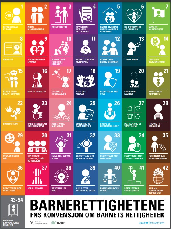FNs barnekonvensjon inneholder en rekke individuelle og kollektive rettigheter som Norge er forpliktet til å respektere, sikre og oppfylle for barn. Denne gjelder som norsk lov med forrang fremfor annen lovgivning.