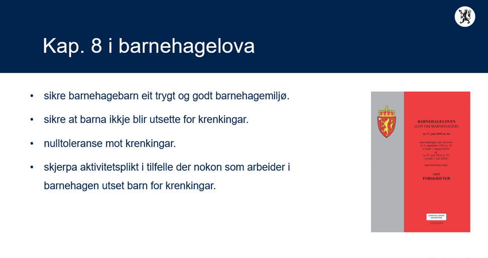 - Innhold: Barnehagemyndighetens sitt ansvar for veiledning og tilsyn (Barnehageloven §10) opp mot kapittel 8 (Psykososialt barnehagemiljø). Risikovurdering og informasjonsinnhenting fra eiere og barnehagene i kommunene. Praksiseksempler. Samarbeid mellom KS og Statsforvalteren.