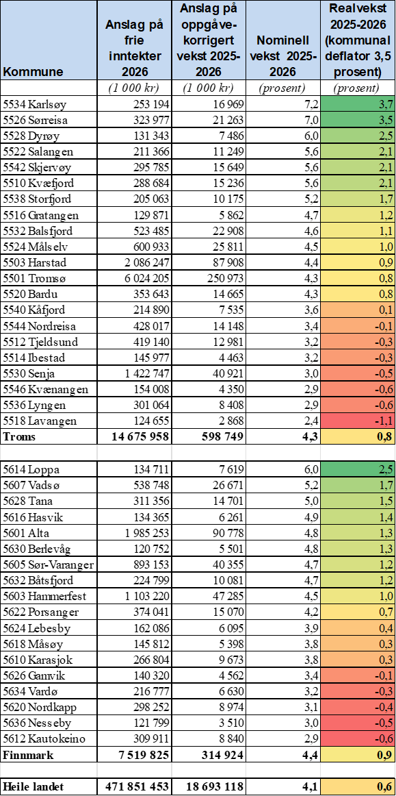I forslaget til statsbudsjett for 2026, vil Regjeringen øke de frie inntektene til kommunene i Troms og Finnmark med om lag 913,7 millioner kroner. 27 av 39 kommuner får økte inntekter.