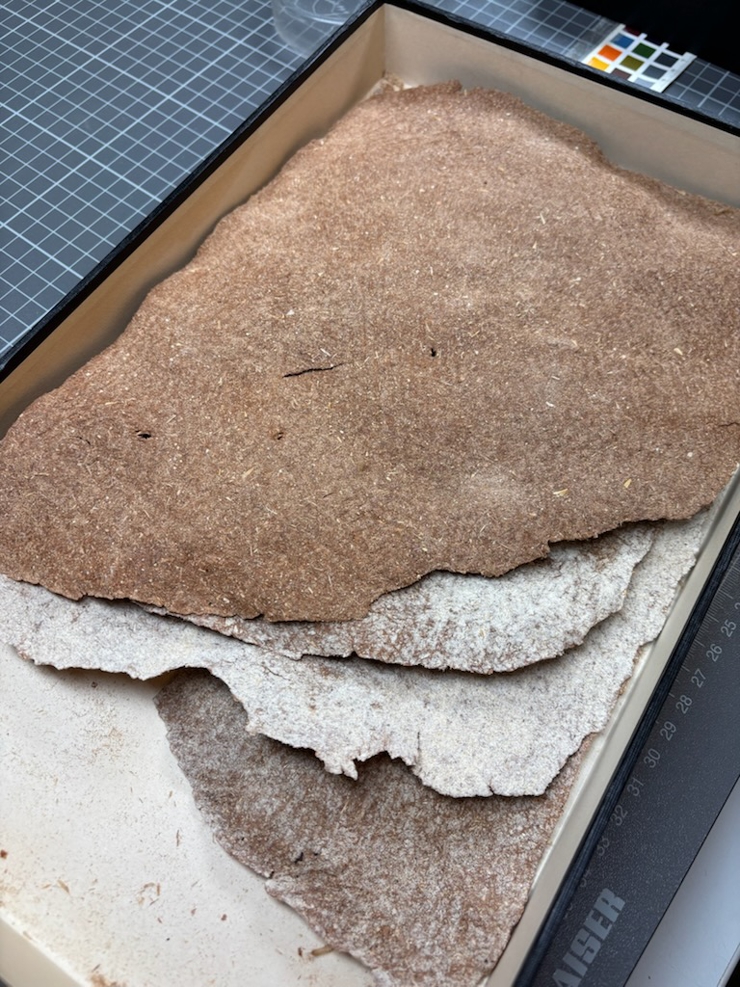 "Flatbrød av almebark, laget efter gammel opskrift, de lyse leiver med byggmel og de mørke av barkmel som breidmjøl. Eikesdalen våren 1935, Trond Utigard" Naturhistorisk museum, Oslo