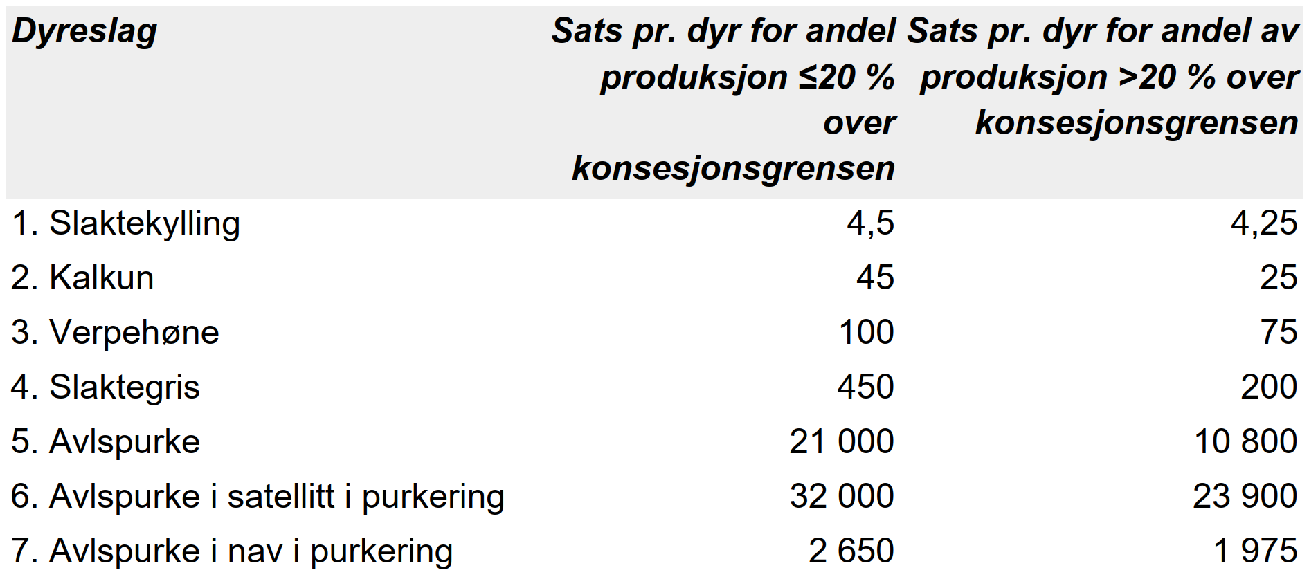 Tabellen er henta frå forskrift om endring i forskrift 1. april 2004 nr. 611 om regulering av svine og fjørfeproduksjonen.