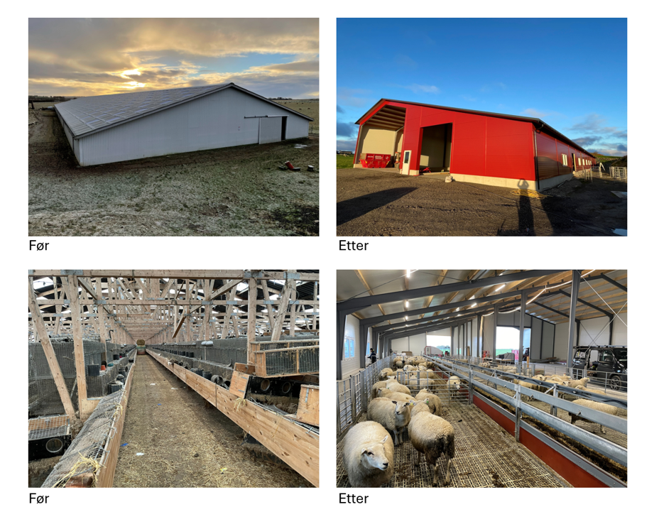 Dei reiv anlegget i løpet av første halvår i 2025, men valde å behalde gjødsellageret. På same stad som pelsdyrhusa stod har dei no bygd opp eit nytt sauefjøs i kombinasjon med reiskapslager. Bygningen er ein stålhall med sandwichelement. I det 400 m2 store sauefjøset er det plass til 150 vinterfôra sauer, og det blei teken i bruk i byrjinga av oktober.