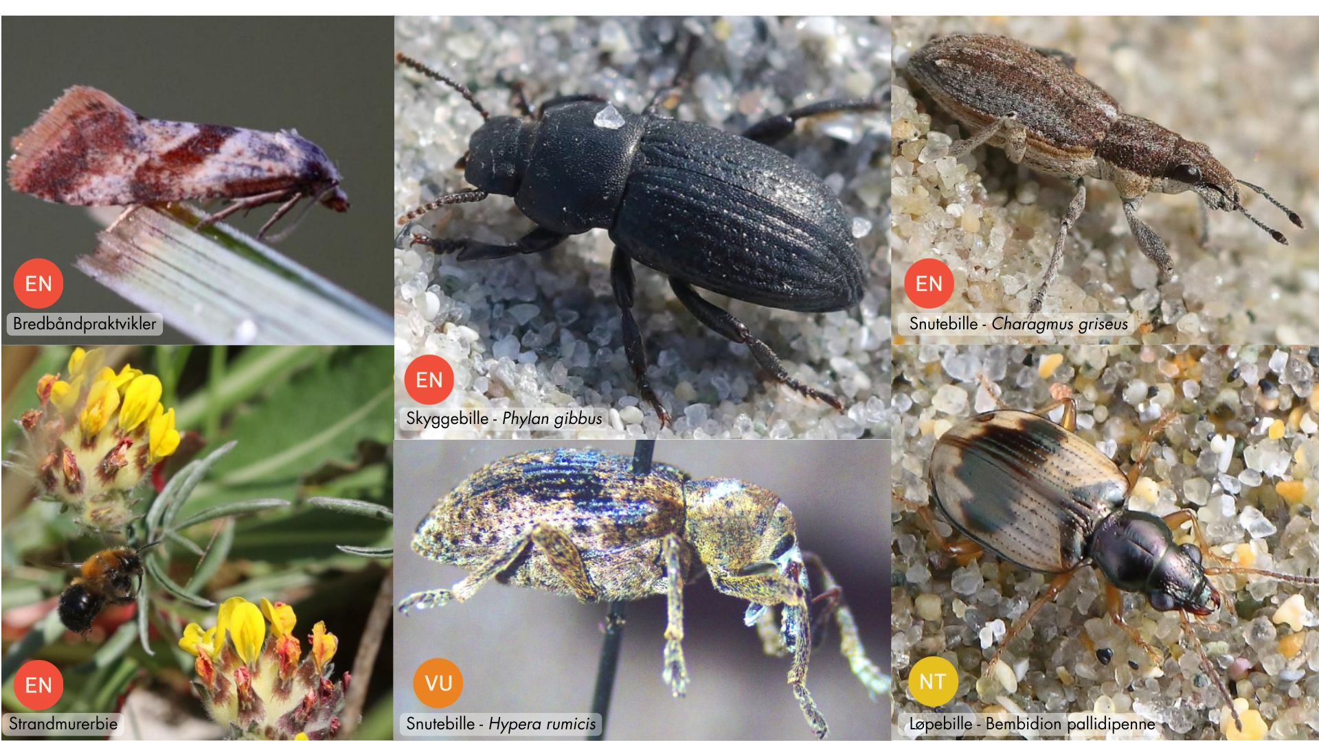 Rødlista insekter du kan finne i sanddynene på Brusand. Foto: Even Mjaaland og Kjell Mjølsnes