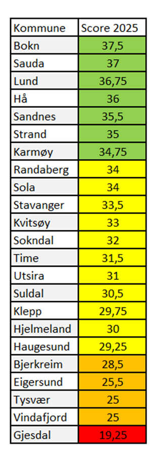 I år er det ingen kommunar som ligg i mørkegrøn sone. Sju kommunar ligg i lysegrøn sone, fire i oransje sone og éin kommune i raud sone. Til samanlikning var det i 2024 tre kommunar i mørkegrøn sone og éin i mørkeraud sone.