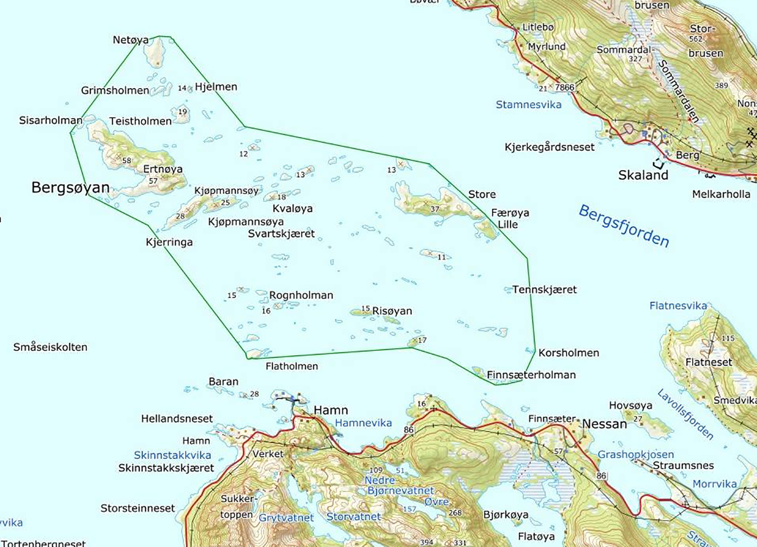 - Består av en skjærgård med rundt 90 øyer, holmer og skjær.