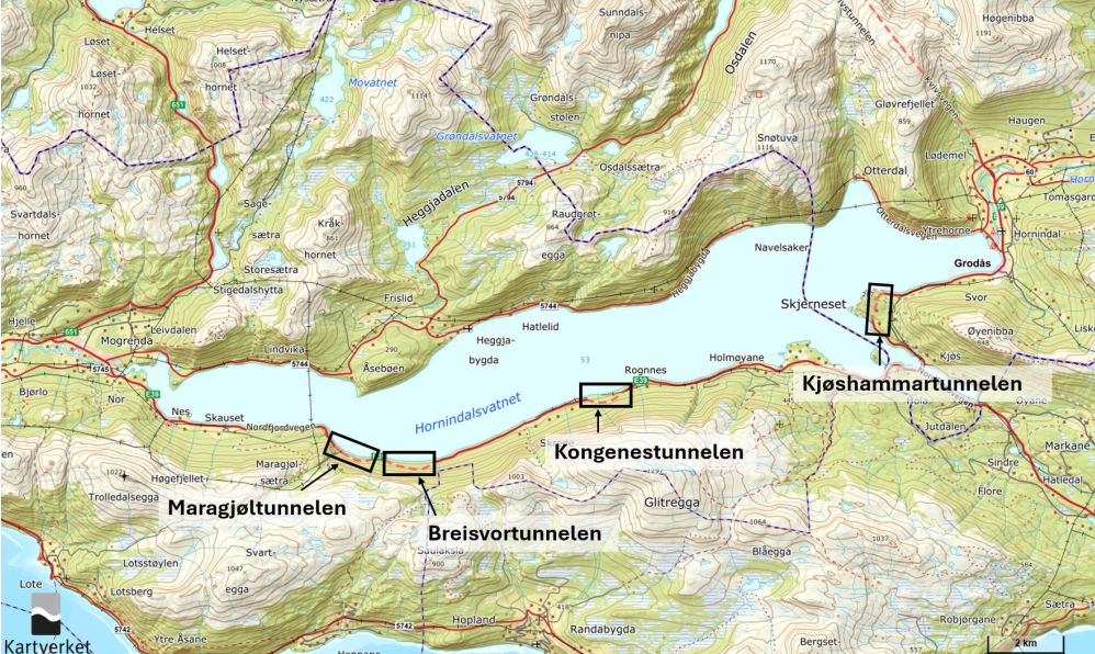 Statens vegvesen skal oppgradere E39 Maragjøl-, Breisvor-, Kongenes- og Kjøshammartunnelen langs Hornindalsvatnet og søkjer om løyve etter forureiningslova for anleggsarbeida.