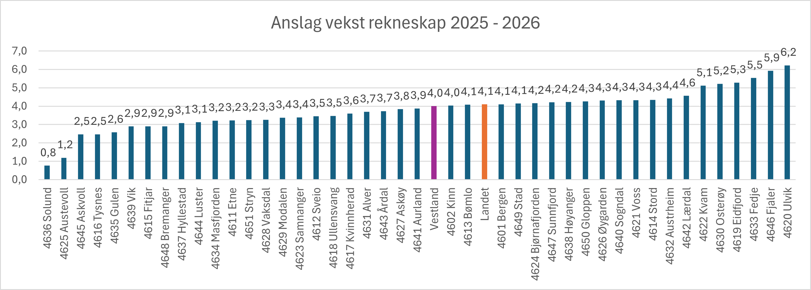 Pårekna vekst i frie inntekter for kommunane i Vestland frå anslag rekneskap 2025 til framlagt statsbudsjett 2026 er 4 prosent, medan snittet for landet er 4,1prosent. For Vestland ligg 24 kommunar under veksten for landet, og 19 kommunar ligg likt eller over. Anslag på deflator er sett til 3,5 prosent for 2026.